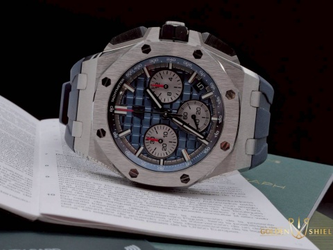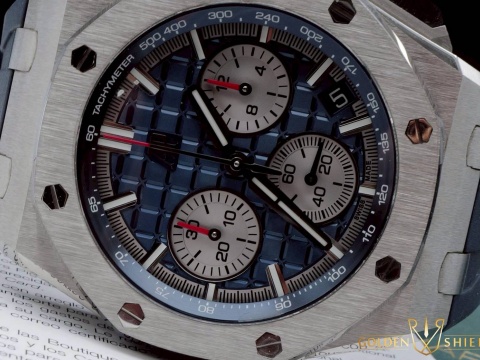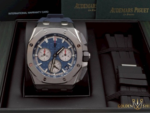 | Audemars Piguet 愛彼 AP錶 Royal Oak Offshore 皇家橡樹 離岸型 飛返 計時碼錶 26420TI.OO.A027CA.01 藍色「Mega Tapisserie」格紋面盤 鈦金屬 2022年保卡 新式快拆錶帶 26420 TI 自動上鍊 |