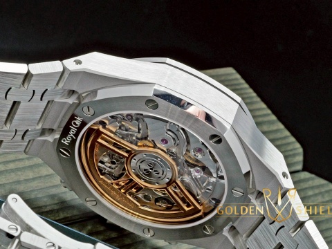 皇家橡樹獨特八角形螺絲外露設計錶圈 / 不鏽鋼材質錶殼及折疊帶扣、計時按把、旋入式錶冠 / 鐫刻軍綠色「Grande Tapisserie」大型格紋錶面 / 螢光立體時標與皇家橡樹指針 / 藍寶石水晶玻璃鏡面及透明錶背 |