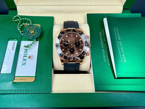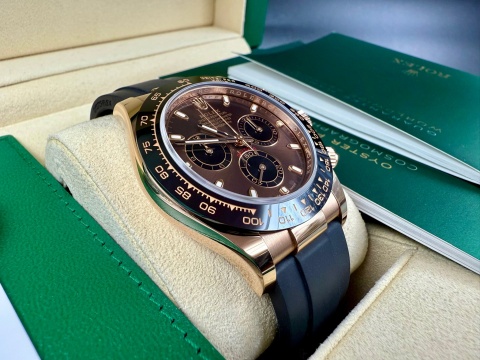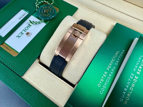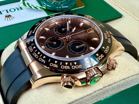18K永恆玫瑰金材質錶殼、摺疊帶扣、旋入式錶冠、計時按把及旋入式底蓋 / 最新款巧克力熊貓面盤 / 夜光指針及時標 / Cerachrom黑色陶瓷計視距儀刻度錶圈 / 勞力士新式Oysterflex錶帶黑色橡膠錶帶 / 藍寶石水晶玻璃鏡面 / 防偽內圈 |